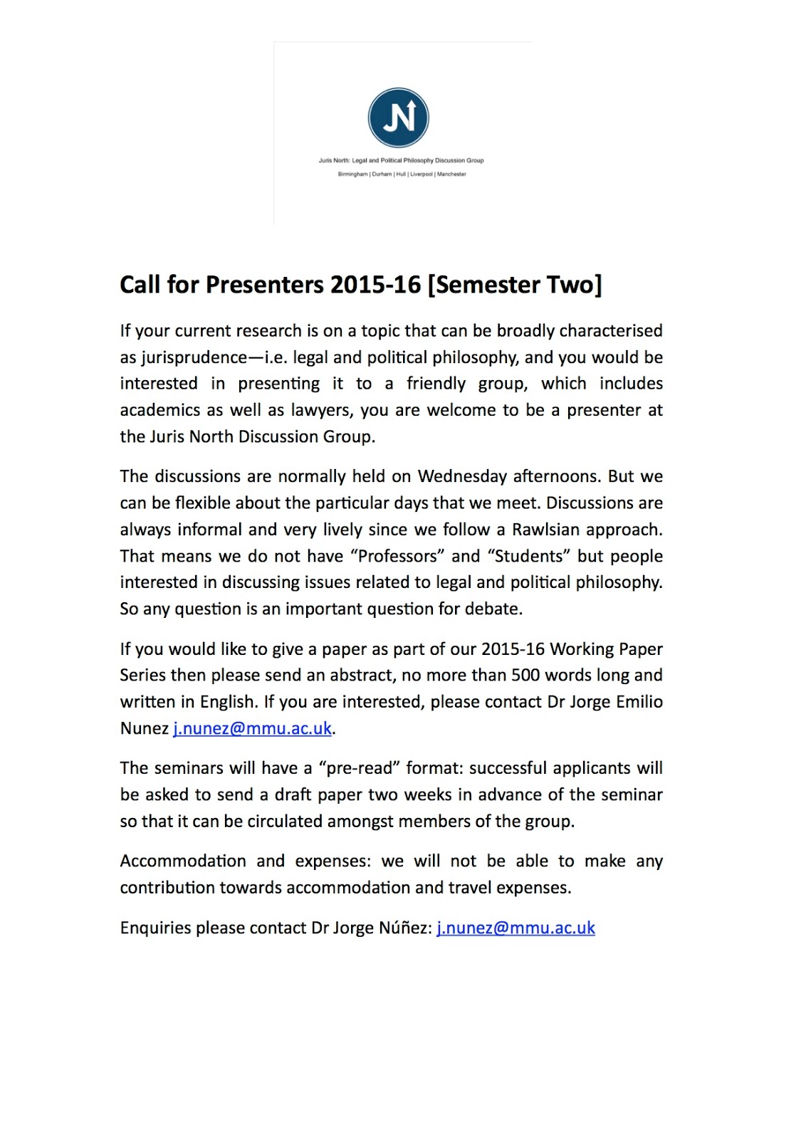 If your current research is on a topic that can be broadly characterised as jurisprudence—i.e. legal and political philosophy, and you would be interested in presenting it to a friendly group, which includes academics as well as lawyers, you are welcome to be a presenter at the Juris North Discussion Group.