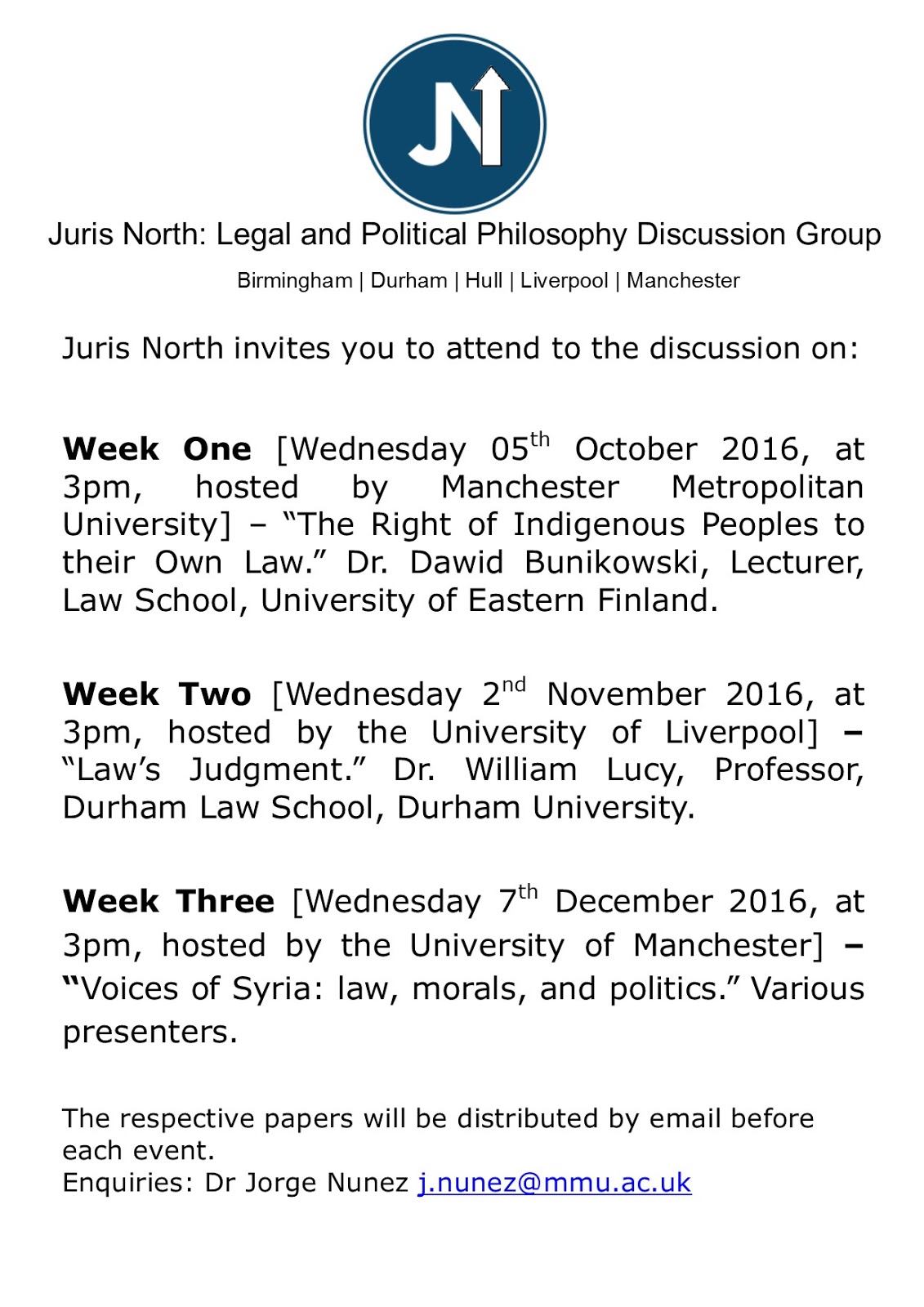 Week One [Wednesday 05th October 2016, at 3pm, hosted by Manchester Metropolitan University] – “The Right of Indigenous Peoples to their Own Law.” Dr. Dawid Bunikowski, Lecturer, Law School, University of Eastern Finland.