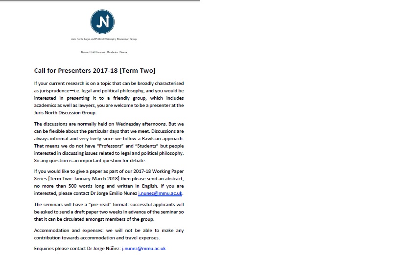 If your current research is on a topic that can be broadly characterised as jurisprudence—i.e. legal and political philosophy, and you would be interested in presenting it to a friendly group, which includes academics as well as lawyers, you are welcome to be a presenter at the Juris North Discussion Group.