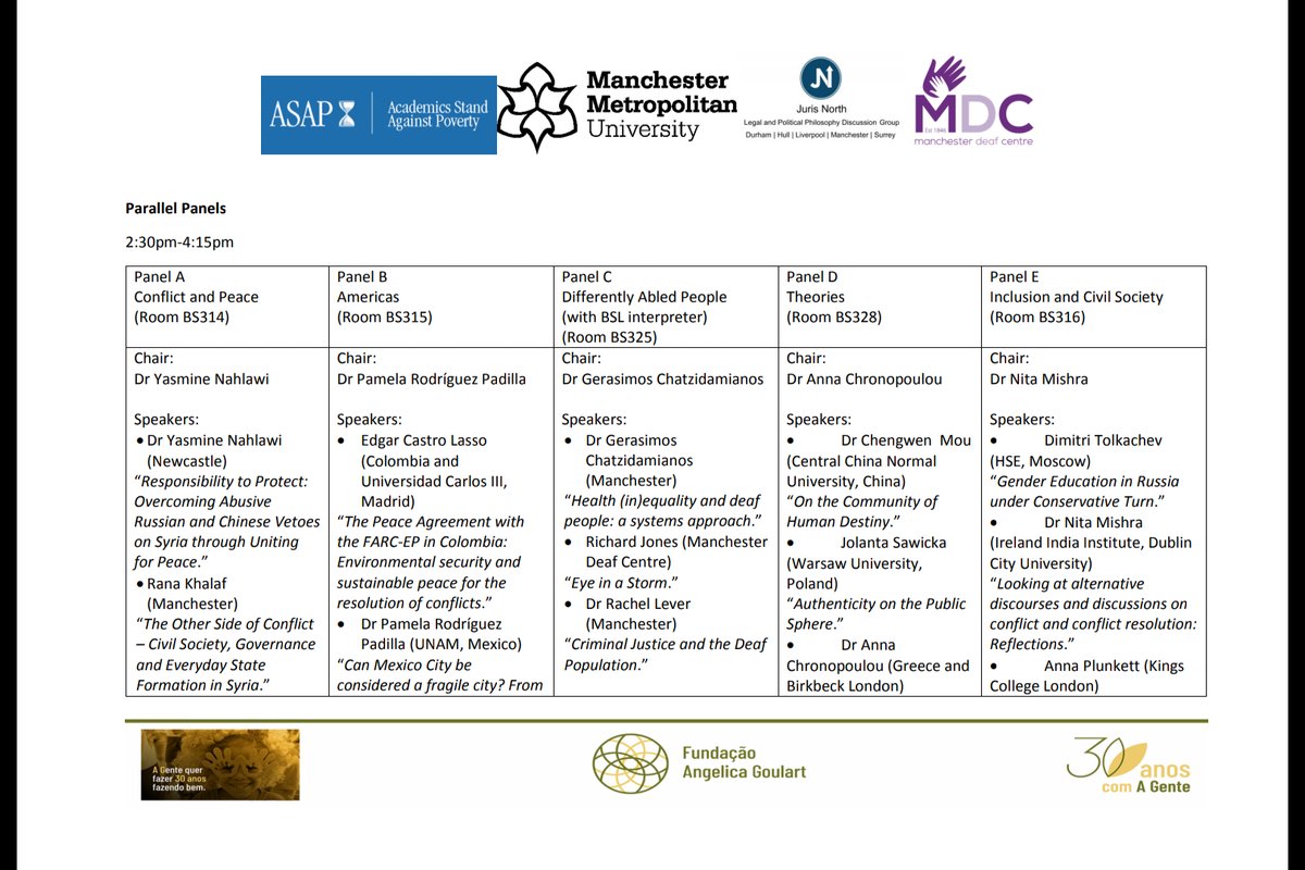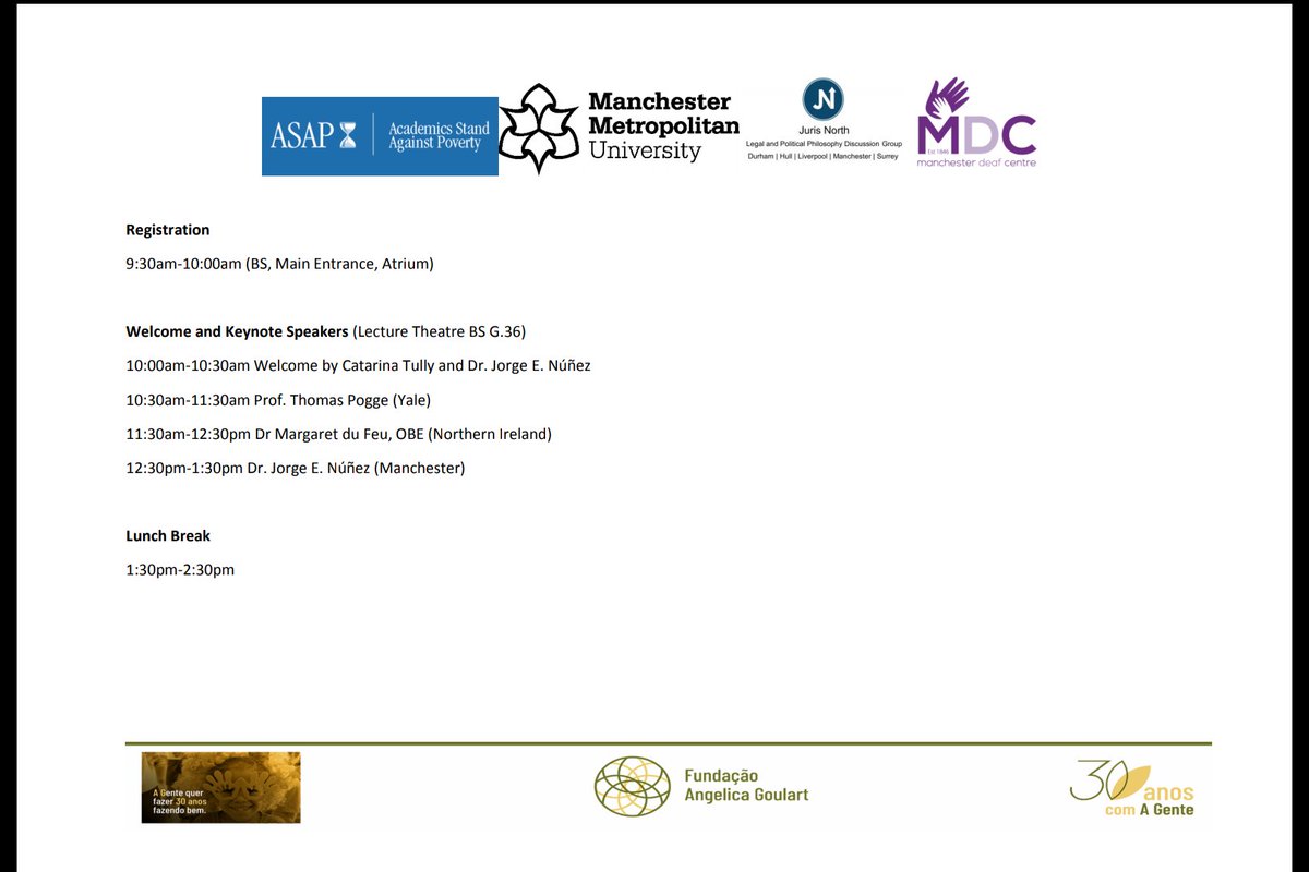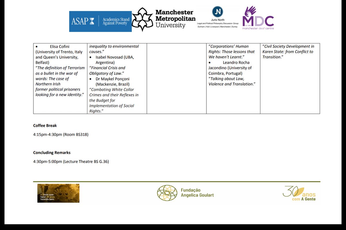 We have representatives of 10+ countries. This conference will bring together academics (law, political sciences, philosophy, sociology, etc.), non-governmental organisations and activists to present, explore, and discuss ways in which we may address worldwide current issues by means of global justice. The aim of the conference is to provide a forum for debate over some key issues (poverty, access, dispute resolution and terrorism) ranging between particular case studies to their global impact, and including analysis of political, sociological, legal, policy, and everyday conceptualizations. The conference will provide a forum to analyse developments, and seek to discern underlying social, legal and political processes to address them