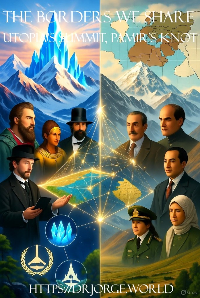 Amid the radiant glow where crystalline summits pierce the azure veil, Utopia’s lofty pinnacle rises like a beacon of imagined perfection, its ethereal heights now entwined with the tangled knot of the Pamir Mountains, where rugged peaks bear the scars of earthly contention. Here, Dr. Jorge, the series’ navigator, stands with Sherlock Holmes, the astute analyst, Dr. John Watson, his faithful recorder, and King Arthur, steward of Excalibur’s enduring promise, joined by the historical figures of Emomali Rahmon, Tajikistan’s leader whose rule shapes the Pamirs, Sooronbay Jeenbekov, Kyrgyzstan’s former president whose tenure navigated border tensions, and Sir Francis Younghusband, the British explorer whose 19th-century expedition etched colonial lines. In The Borders We Share, we seek not the imposition of ideals but an ascent to a practical harmony, where borders transform into threads of mutual understanding. As the morning sun weaves golden strands across the peaks, we climb Utopia’s summit and the Pamir’s knot, where utopian visions might unravel into a real symphony of peace.