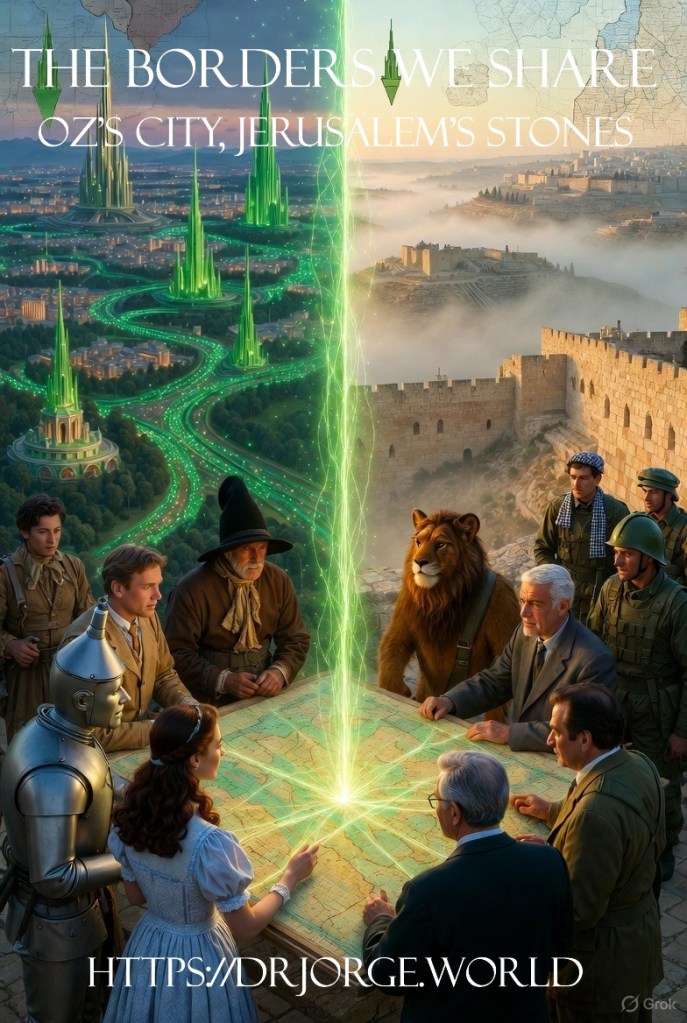 At the jagged lip where the Judean hills cradle millennia of prayer, Jerusalem’s golden limestone walls rise like a hymn frozen in stone, now entwined with the dazzling emerald spires of Oz’s fabled City, where illusions of power shimmer in the desert sun. Here, Dr. Jorge, the series’ sage, joins Sherlock Holmes, the unrivalled deductive mind, Dr. John Watson, his ever-present chronicler, King Arthur, wielder of Excalibur’s enduring oath, Robin Hood, the Sherwood outlaw whose arrow finds truth in tyranny’s heart, Dorothy Gale, the Kansas dreamer turned guardian of the Emerald City, the Scarecrow seeking wisdom, the Tin Man yearning for compassion, the Cowardly Lion pursuing courage, alongside historical luminaries David Ben-Gurion, Israel’s founding visionary whose ideals forged a nation, Golda Meir, the iron-willed leader whose resolve shaped its defences, Yasser Arafat, Palestine’s revolutionary voice whose struggle embodied resistance, and Mahmoud Abbas, the steadfast negotiator whose diplomacy seeks a path forward. In The Borders We Share, we pursue not the conquest of stone but the unravelling of riddles to forge peace, where borders become puzzles solved in unity. As the morning sun gilds the Temple Mount and ignites the Emerald City’s gates, we delve into Jerusalem’s sacred labyrinth and Oz’s glittering avenues, where the Israel-Palestine standoff might crack open to reveal a harmony etched in limestone and emerald.