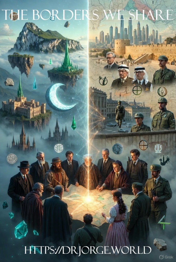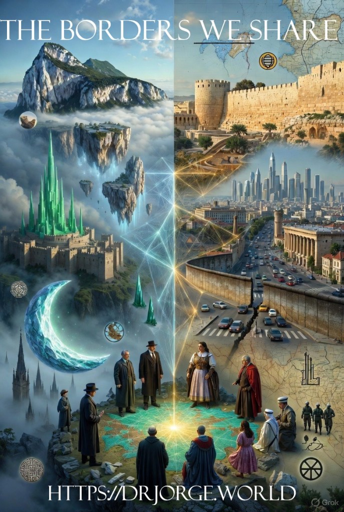 The aim has been to elevate borders from sources of exclusion and conflict into foundations of shared sovereignty and belonging, transforming the rigid terrains of urban division into landscapes of possible harmony. Each post, spanning Posts 31 to 36, has introduced unique landscapes rich with cultural and symbolic significance, populated by both imagined leaders and historical figures whose legacies continue to shape the narratives of these elevated and enclosed domains. This ascent has not only mapped the physical heights and depths of cities but also the emotional, ideological, and moral summits that define human connection to place in the modern world. The journey has been marked by a consistent thread of cautious hope, where the challenges of displacement, ideological rigidity, economic exploitation, and historical mistrust are met with innovative solutions rooted in dialogue, collaboration, and the principles of egalitarian shared sovereignty. Through the lens of Dr. Jorge’s scholarly guidance, alongside the analytical prowess of Sherlock Holmes, the meticulous documentation of Dr. John Watson, and the noble presence of King Arthur, we’ve witnessed councils of diverse voices—spanning fictional characters like Balnibarbi the philosopher, Dorothy Gale, Governor Ademus, and King Laputian to historical giants like Sheikh Mohammed bin Rashid, John Hume, David Trimble, Mo Mowlam, and Willy Brandt—propose practical frameworks for peace. These efforts have sought to transform the rigid terrains of urban conflict into landscapes of harmony, offering a blueprint that resonates beyond the cities into the broader multiverse, concluding Section 6 with a vision of borders as bridges rather than barriers.