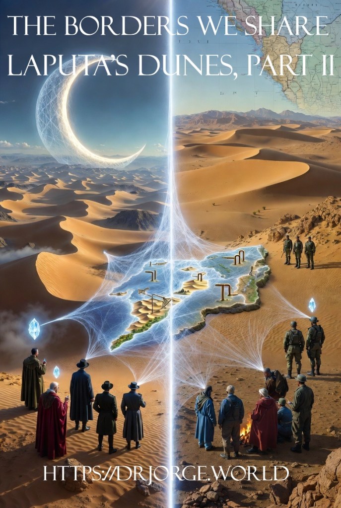 Arthur stands on a dune that is half Laputa and half Sahara, watching grains from both deserts swirl together in the same gust. He says only: “A desert does not care who claims it. It only remembers who walked it together.”