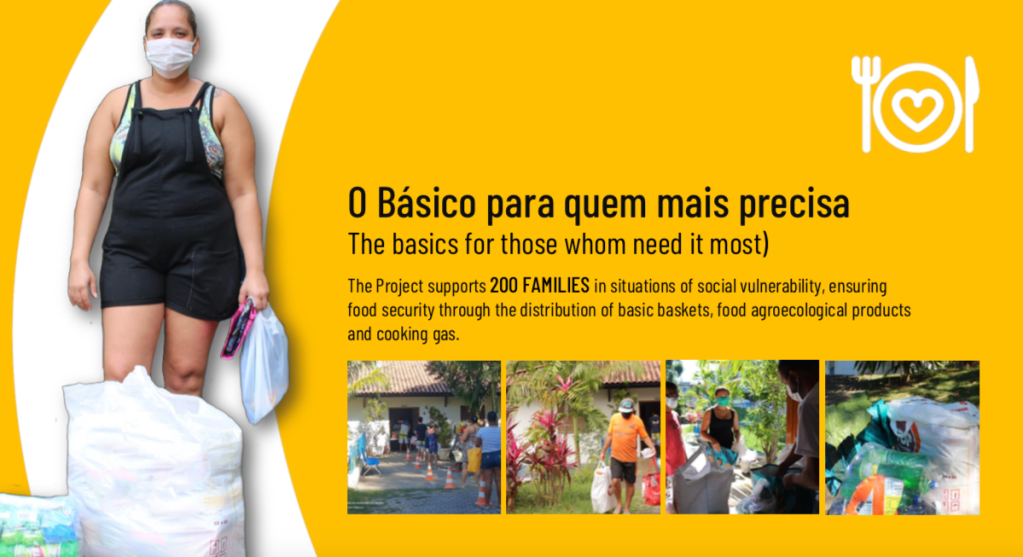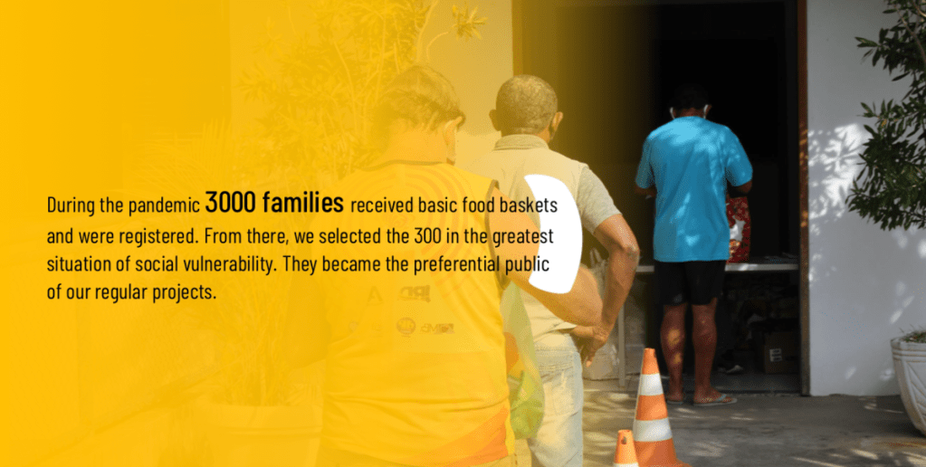 Recebemos 5 toneladas de alimentos, 1400 litros de material de limpeza e higiene e mais de R$ 4.000,00 reais em dinheiro e distribuímos como cestas turbinadas para 350 famílias, cerca de 2.000 pessoas aqui de Pedra de Guaratiba.