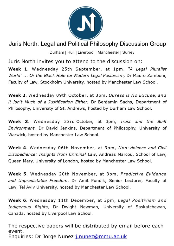 Week 1. Wednesday 25th September, at 1pm, “A Legal Pluralist World” … Or the Black Hole for Modern Legal Positivism, Dr Mauro Zamboni, Faculty of Law, Stockholm University, hosted by Manchester Law School, SB2.01.